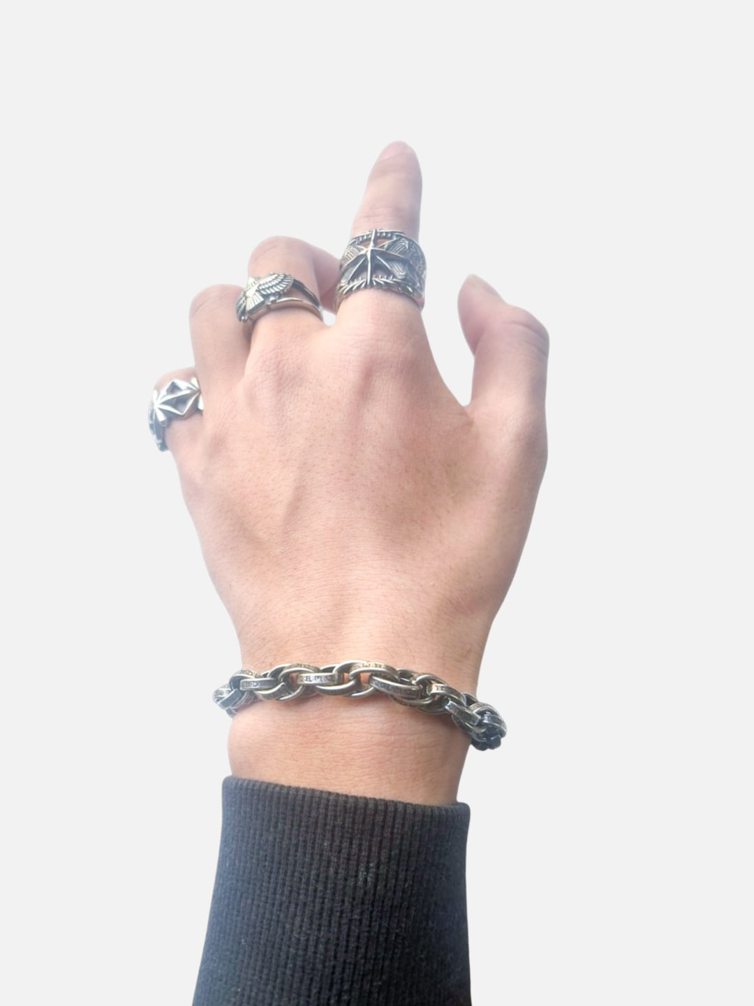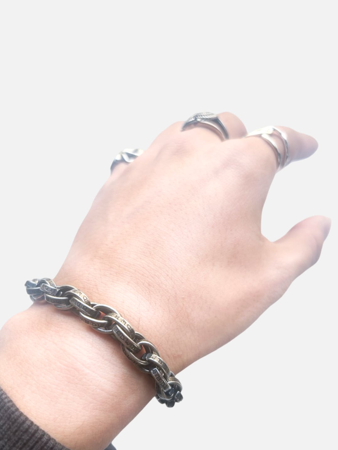 重厚感のあるチェーンとロックモチーフが、手元に無骨な存在感をプラス。