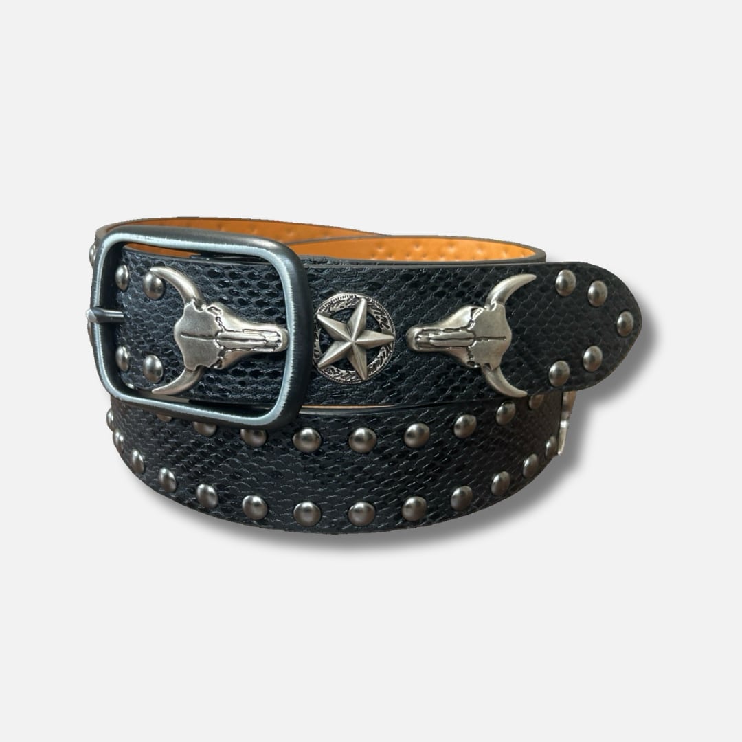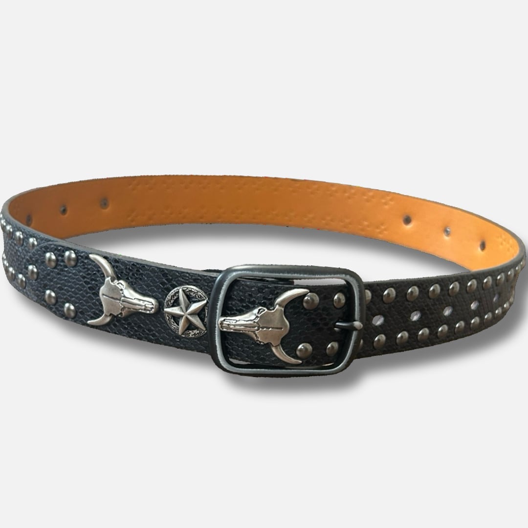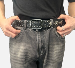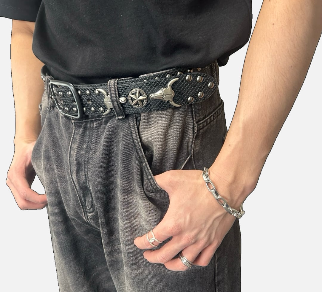 重厚なブルスカルと無骨なスタッズが、腰元に圧倒的な存在感を演出。