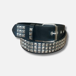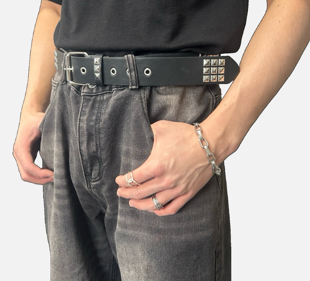 無数のピラミッドスタッズが圧倒的な存在感を放ち、腰元からコーデを引き締める一本。
