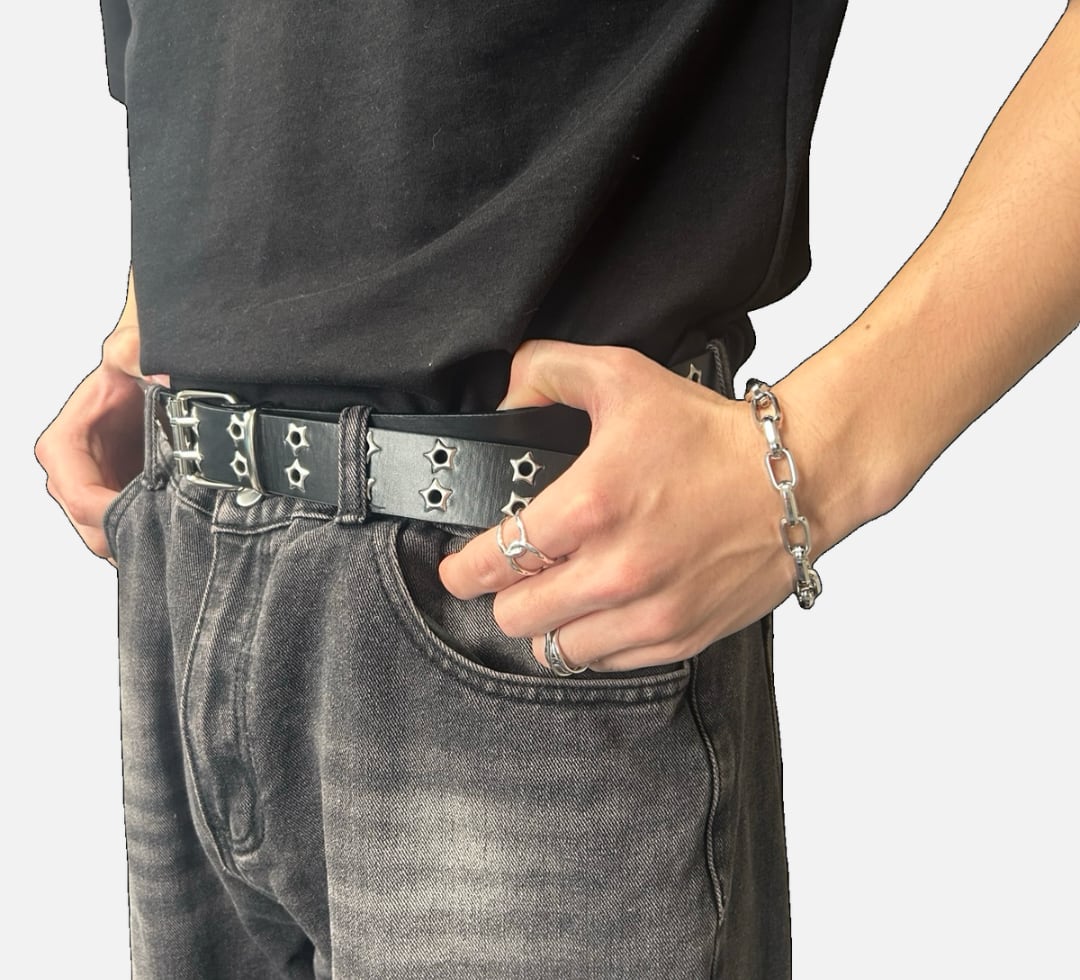 星型スタッズが腰元に鋭い存在感をプラスし、コーデ全体を一気に格上げする一本。